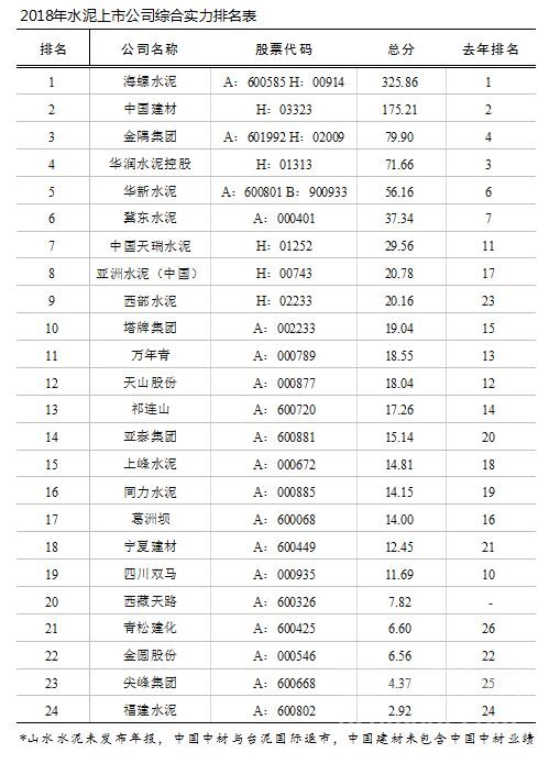 2018年中國水泥上市公司綜合實力排名表