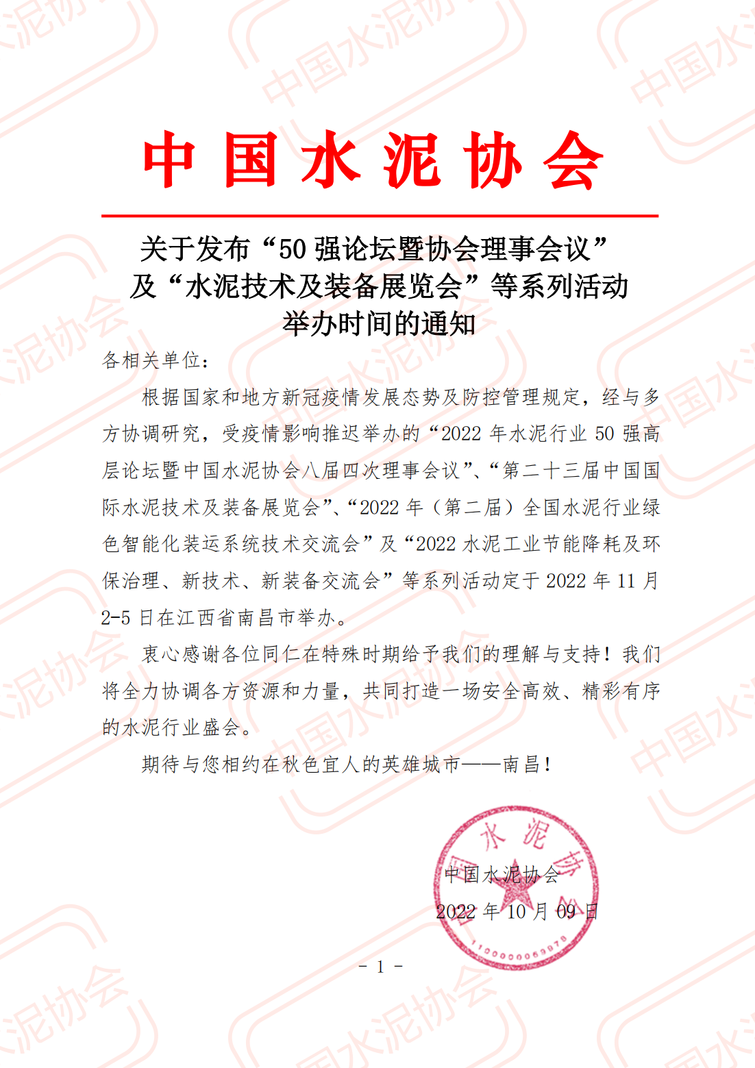 關於發布“50 強論壇暨協會理事會議” 及“水泥技術及裝備展覽會”等係列活動 舉辦時間的通知