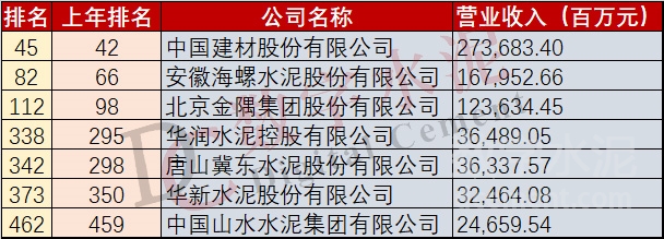 2022年《財富》中國500強排行榜(水泥企業(ye) )