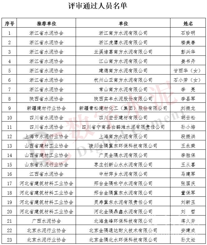 2022年水泥行業(ye) 優(you) 秀總工程師評選工作按照既定程序,由水泥行業(ye) 領導、專(zhuan) 家組成的評選委員會(hui) ,對各省市自治區水泥(建材)協會(hui) 推薦的人員及申報資料進行了認真細致的評審,石珍明等23人(名單附後)通過了評審。根據《關(guan) 於(yu) 開展2022年水泥行業(ye) 優(you) 秀總工程師評選活動的通知》的規定,現予以公示。公示期自2022年7月15日起至2022年7月30日止。在公示期內(nei) ,如對評審結果有異議,請將意見發送到: