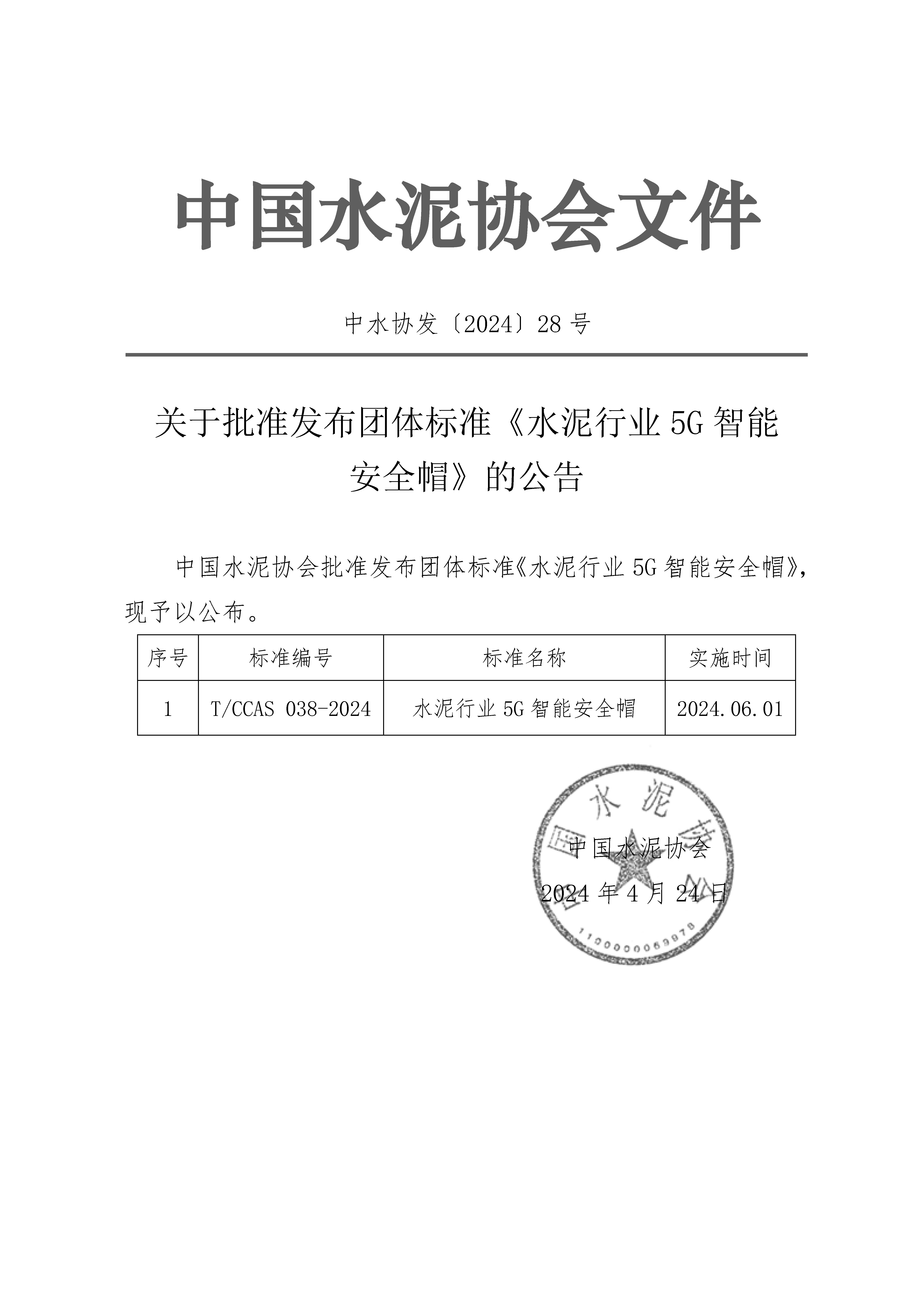 關於批準發布團體標準《水泥行業5G智能安全帽》的公告