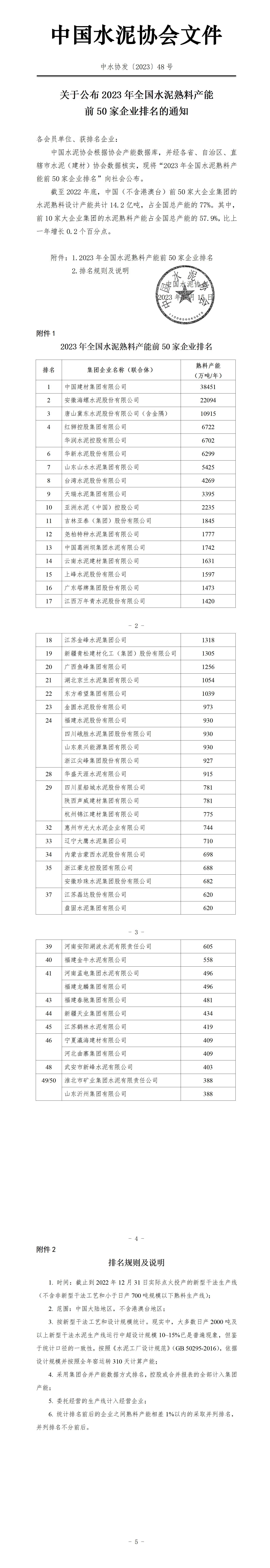 關於公布2023年全國水泥熟料產能前50家企業排名的通知