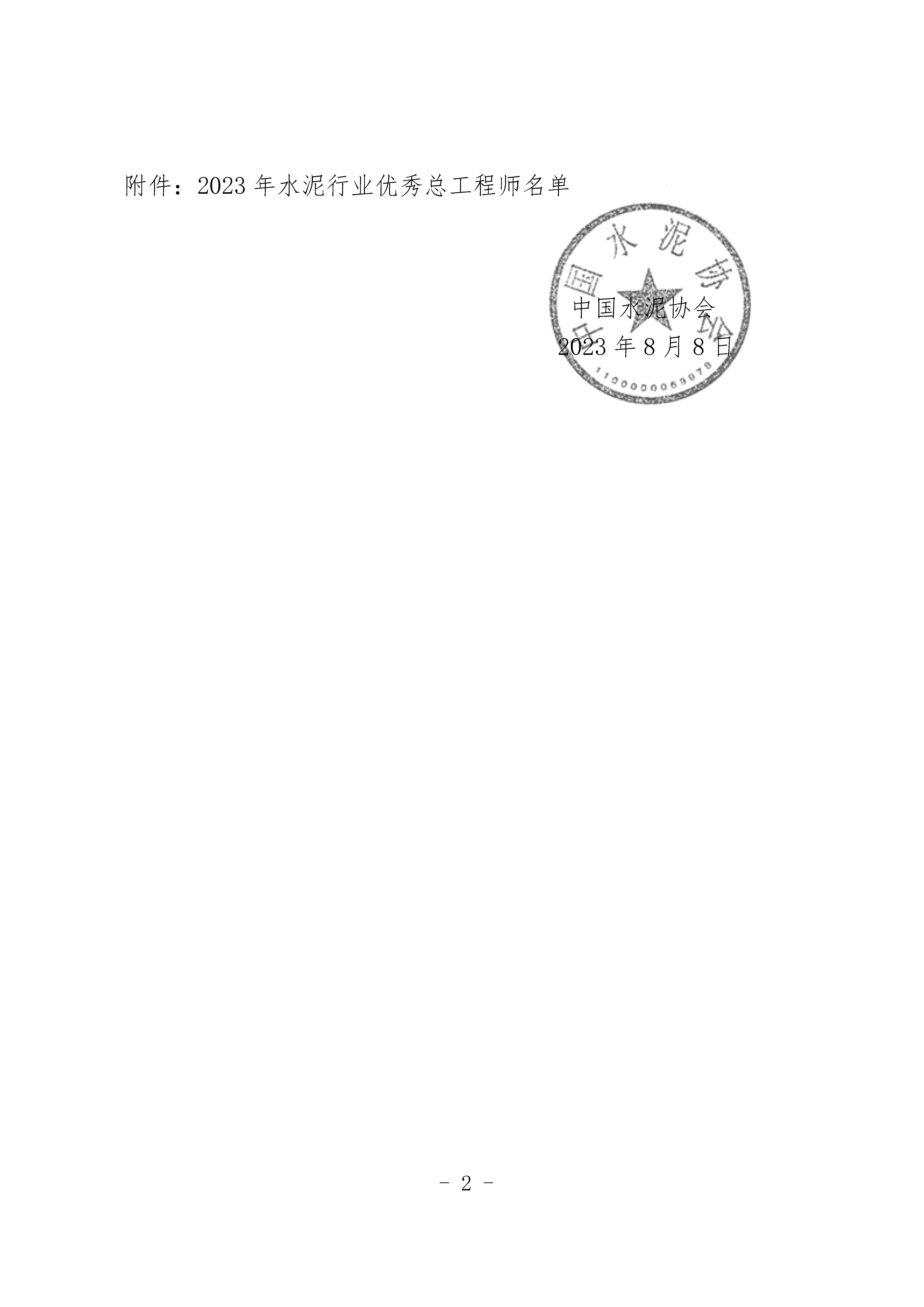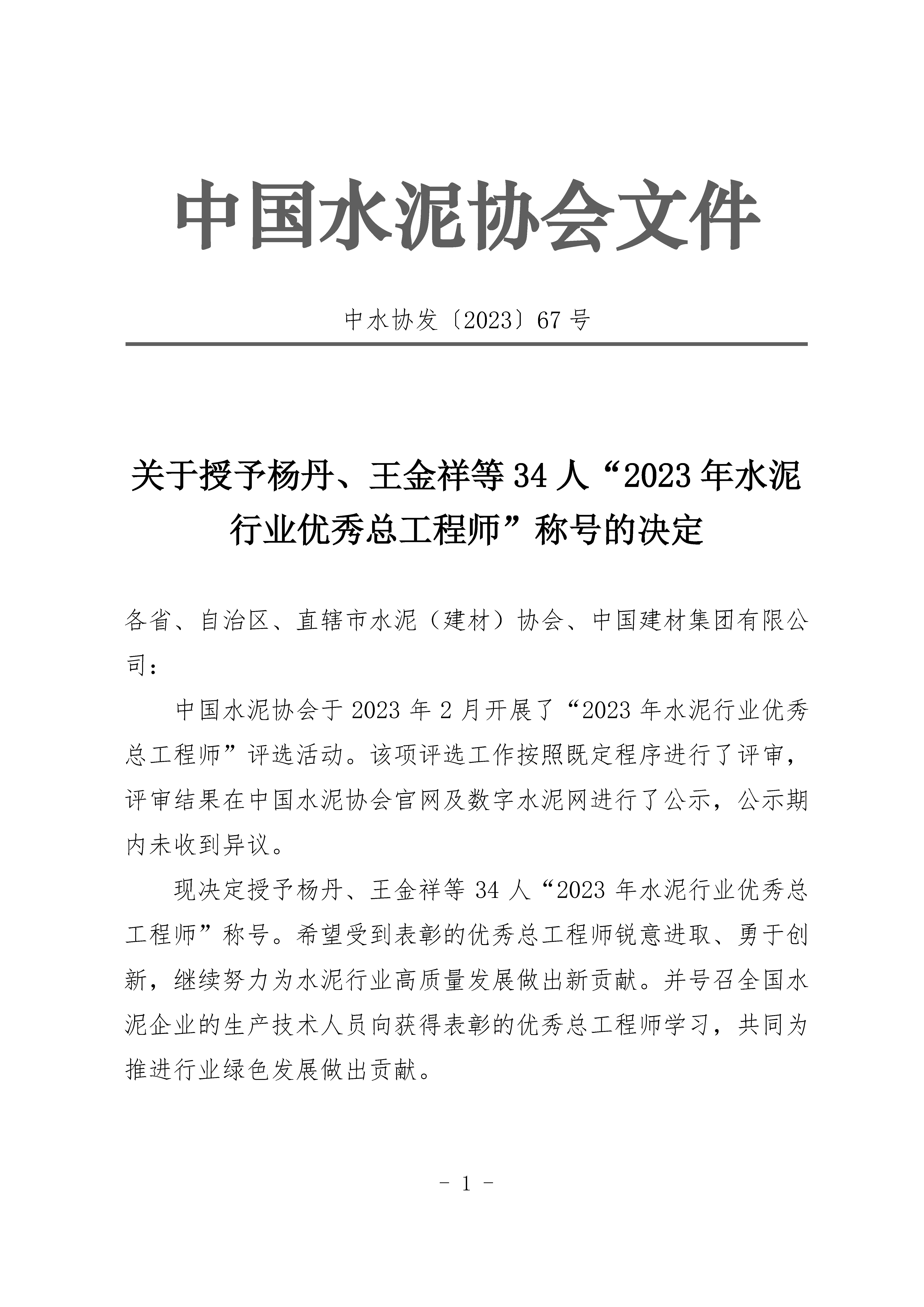 關於授予楊丹、王金祥等34人“2023年水泥行業優秀總工程師”稱號的決定
