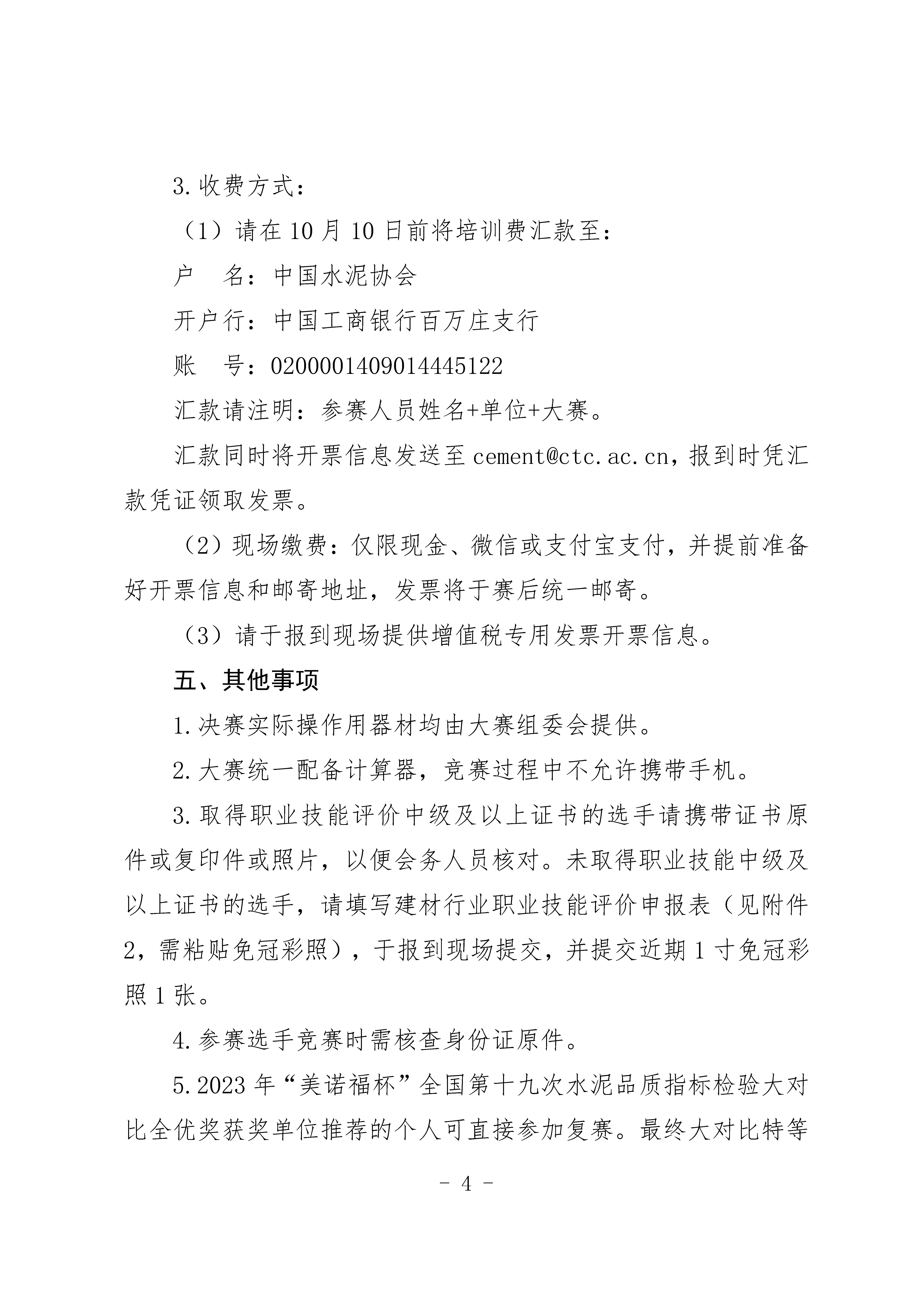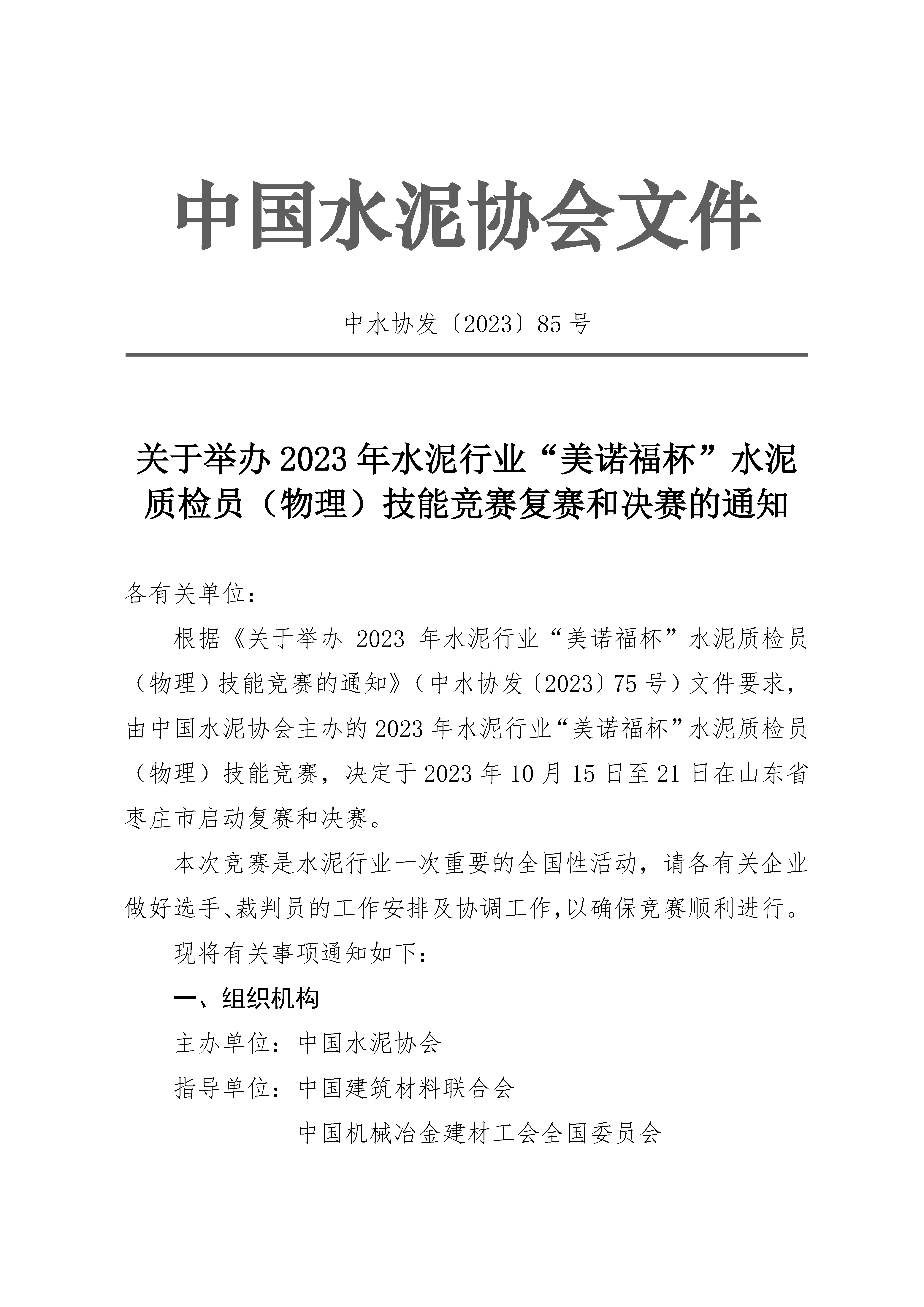 關於舉辦2023 年水泥行業“美諾福杯”水泥 質檢員(物理)技能競賽複賽和決賽的通知 各有關單位: 根據《關於舉辦2023 年水泥行業“美諾福杯”水泥質檢員 (物理)技能競賽的通知》(中水協發〔2023〕75 號)文件要求, 由世界杯直播在线主辦的2023 年水泥行業“美諾福杯”水泥質檢員 (物理)技能競賽,決定於2023 年10 月15 日至21 日在山東省 棗莊市啟動複賽和決賽。 本次競賽是水泥行業一次重要的全國性活動,請各有關企業 做好選手、裁判員的工作安排及協調工作,以確保競賽順利進行。 現將有關事