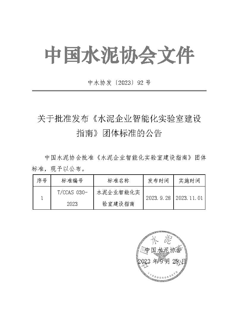 關於批準發布《水泥企業智能化實驗室建設指南》團體標準的公告-世界杯直播在线