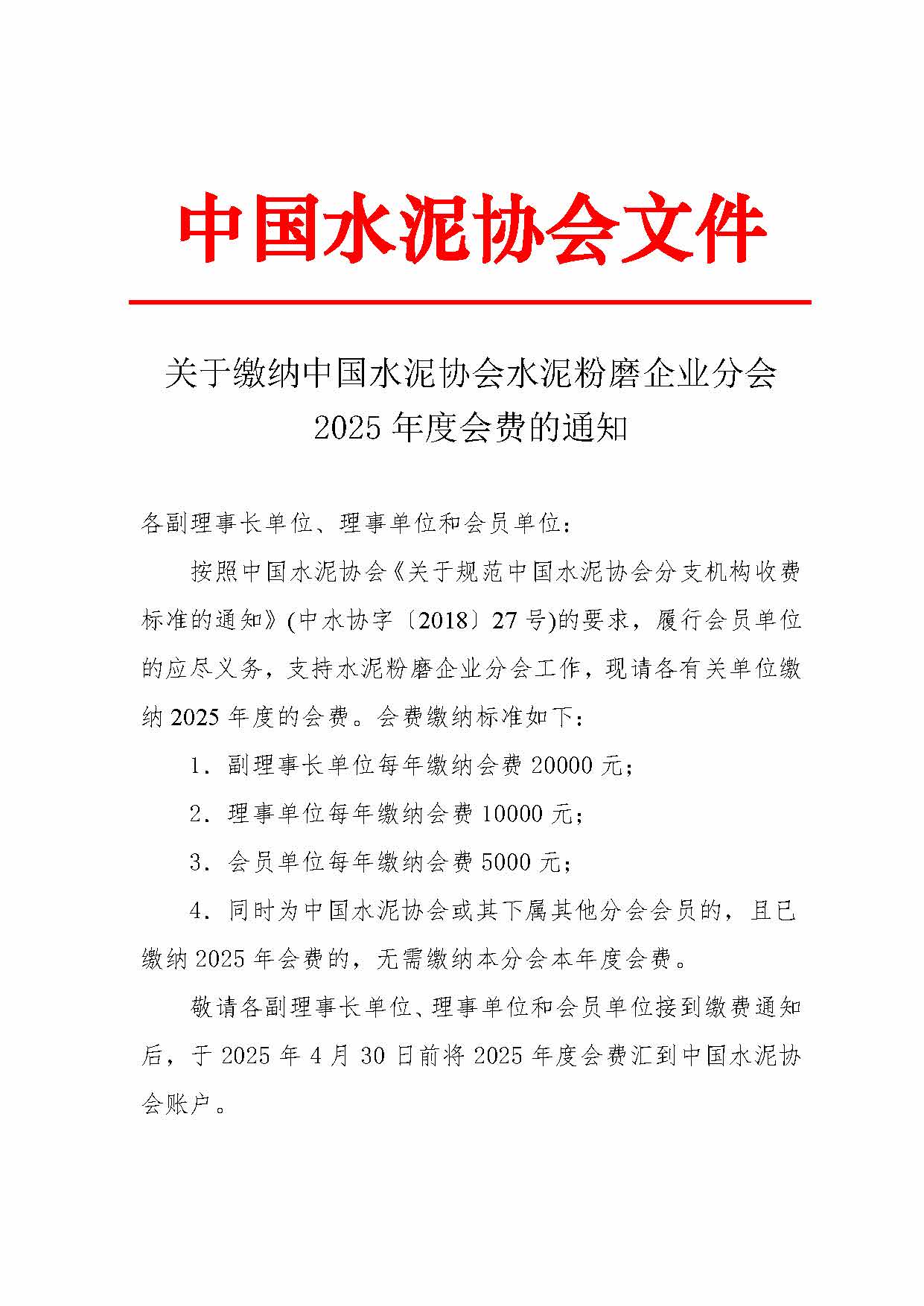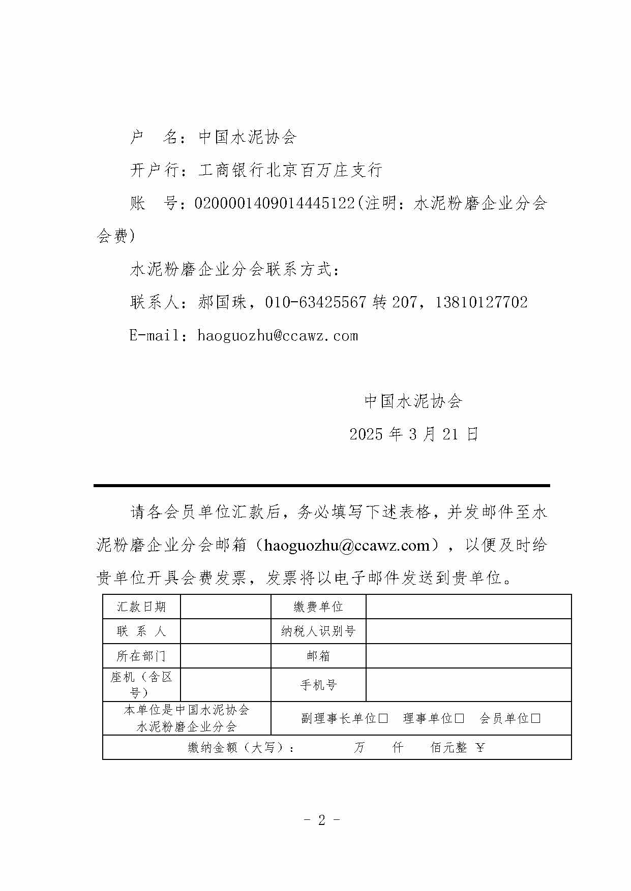 關於繳納世界杯直播在线水泥粉磨企業分會2025年度會費的通知-世界杯直播在线